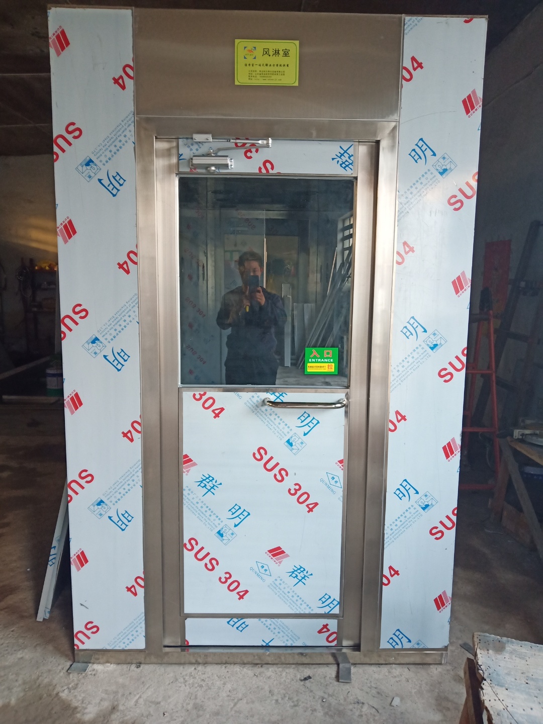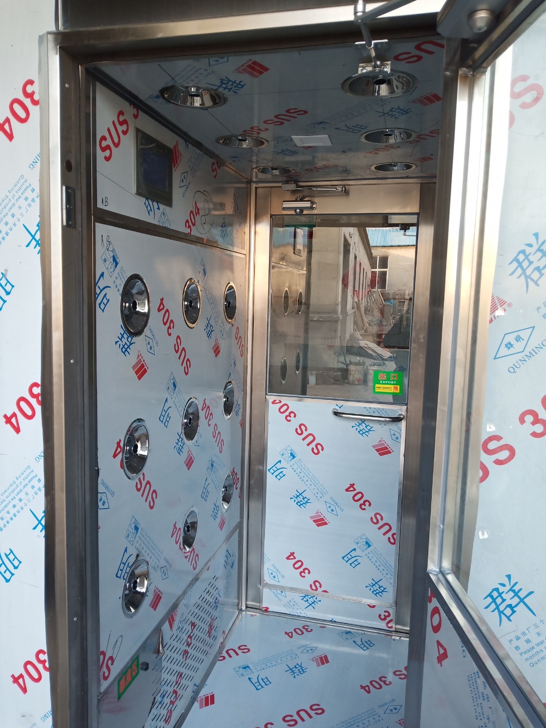 3.拉開不銹鋼風淋門進入風淋室后,風淋門立即自動關閉外門,紅外線感應,風淋自動啟動,吹淋15秒。