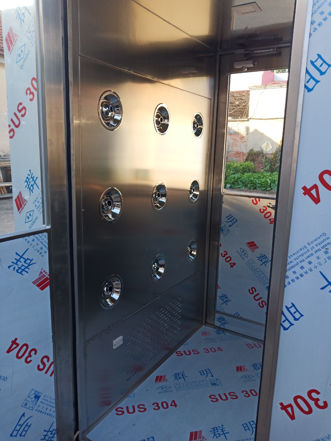 風淋室是人進入潔凈室所必需的通道,它可以減少人進出潔凈室所帶來的污染問題,減少由于人/貨進出帶來的大量塵埃粒子由潔凈室的入口處安裝功能齊全的“氣閘室”可以減少空氣污染微粒的數量,當人/貨通過風淋室時,污染微粒被經過高效過濾的高度潔凈空氣射掉,25m/s以上的高風速確保了有效的噴射和飄移微粒經過初效和高效兩級過濾器基本過濾掉。